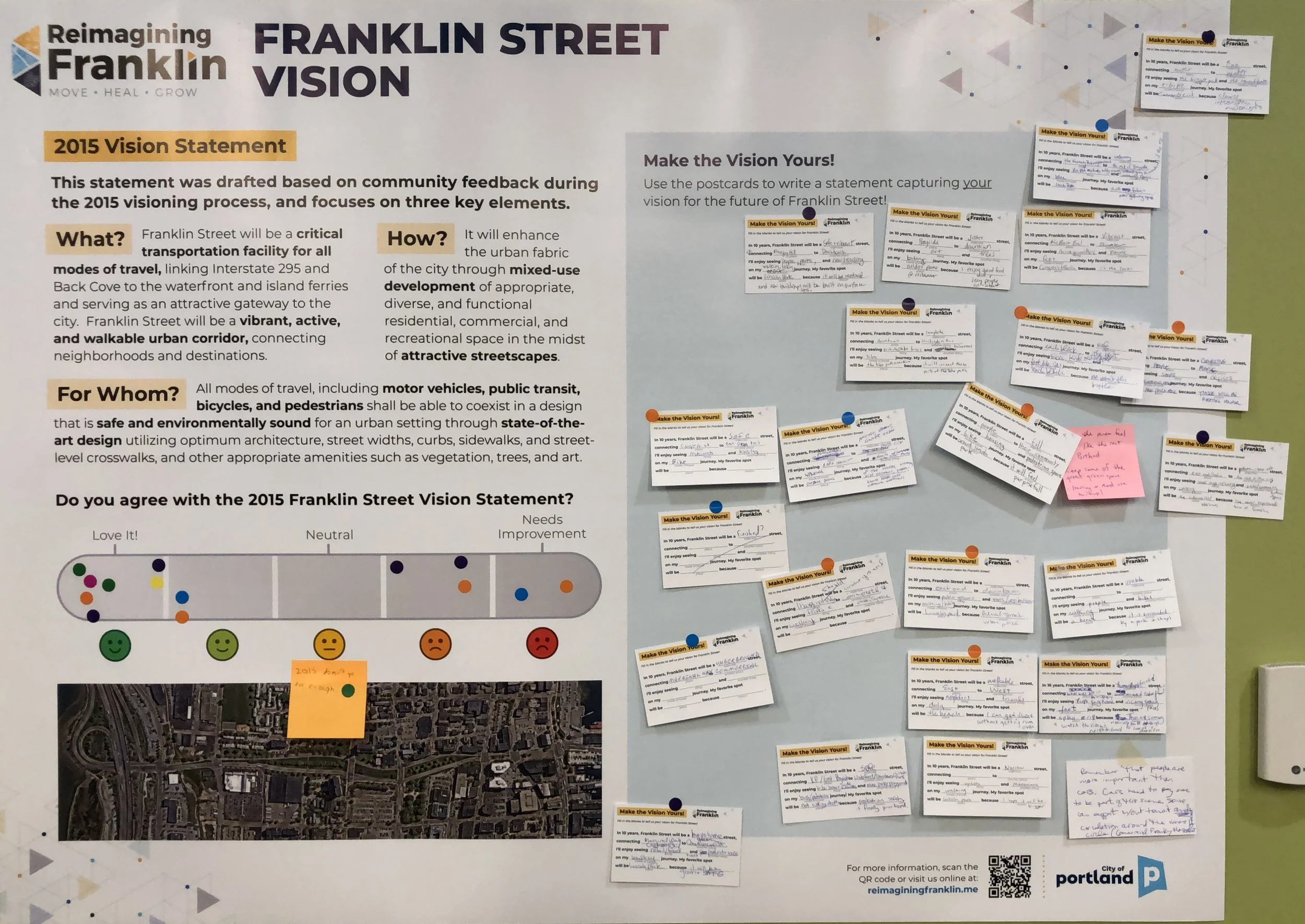 Reimagining Franklin Street began with a review of the Vision and Goals from the 2015 Franklin Street Feasibility Study. Since 2015, significant change has occurred within the City of Portland and in the world in general - the City adopted a new Comprehensive Plan in 2017, Portland’s Plan 2030, and a climate action plan, One Climate Future, in 2021; neighborhoods around Franklin Street have seen steady development pressure; and COVID-19 changed global travel patterns in fundamental ways . Addressing the issues of housing, equity, and sustainability within the opportunities afforded by a redesigned Franklin Street was central to the review of the 2015 Vision and Goals.