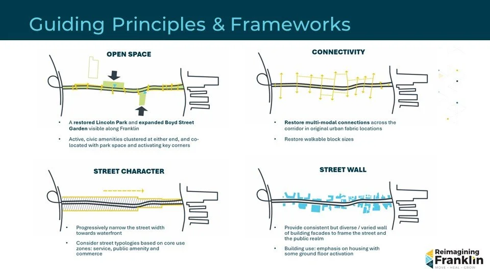 Between April and June, 425 people responded to an online survey about the future of Franklin Street. Survey responses revealed strong public support for a safe, inclusive, multi-modal Franklin Street. Over 90% of respondents agreed that a new Franklin Street should support all means of travel, connect neighborhoods, and incorporate modern amenities. Key priorities included expanding Lincoln Park, adding green and recreational spaces, promoting walking, biking, and public transit, and increasing housing opportunities. Respondents emphasized the importance of features like street trees, safer intersections, improved sidewalks, and high-quality bicycle infrastructure. There was also strong interest in mixed-use development and public plazas, with many calling for equitable, climate-resilient urban design. Responses to open-ended questions allowed respondents to expand on their thoughts.