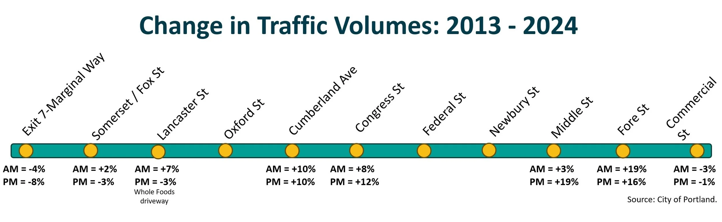 Comparing 2013 traffic levels to 2024 traffic levels show different trends on Franklin Street. At the north end, traffic volumes in both the morning and afternoon peak periods were relatively flat with slight declines or little increase. There was modest increase at Cumberland and Congress, with generally higher increases at Middle and Fore Streets. Traffic changes were essentially flat at the south end at Commercial Street.