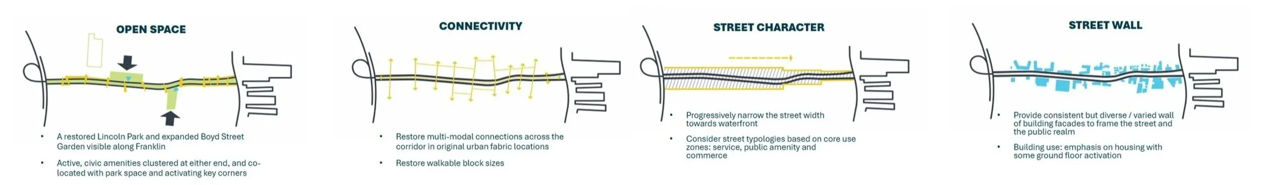 Franklin Street and its context changes as it traverses from Exit 7 and Marginal Way at the north end to Commercial Street at the south. There are four distinct character zones.