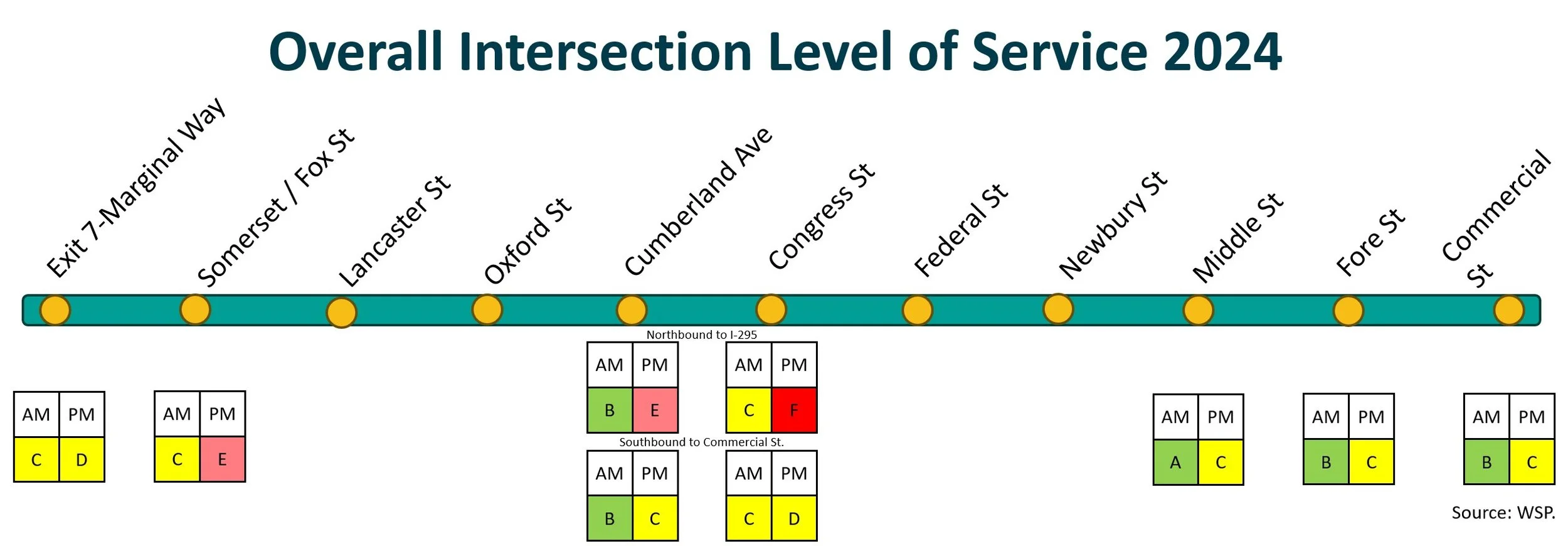 Franklin Street generally maintains a consistent two lanes in each direction at its seven signalized intersections with dedicated left turn lanes at three intersections (Marginal Way, Somerset/Fox and Commercial Street) and otherwise, left turns from the inside travel lane. At both Cumberland Avenue and Congress Street, there are two separated intersections that often create bottlenecks at the inside lanes due to left-turning vehicles and short stacking distance between the signals.