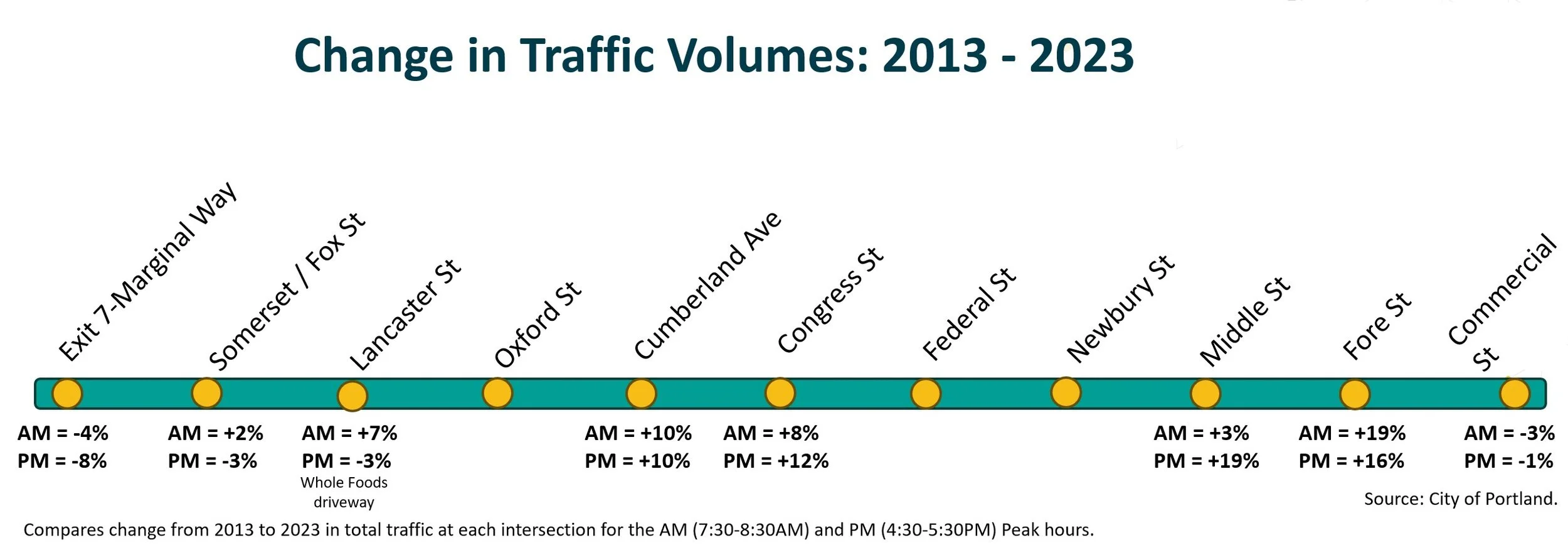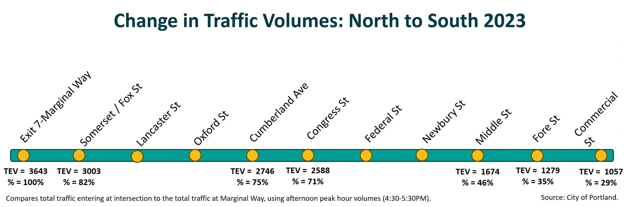 Traffic volumes drop significantly as the street moves south, where the street functions more like a typical urban roadway. At Commercial Street, traffic drops by over 70%. This change in volumes provides opportunities to “right-size'“ the street design to match the traffic and more urban context.