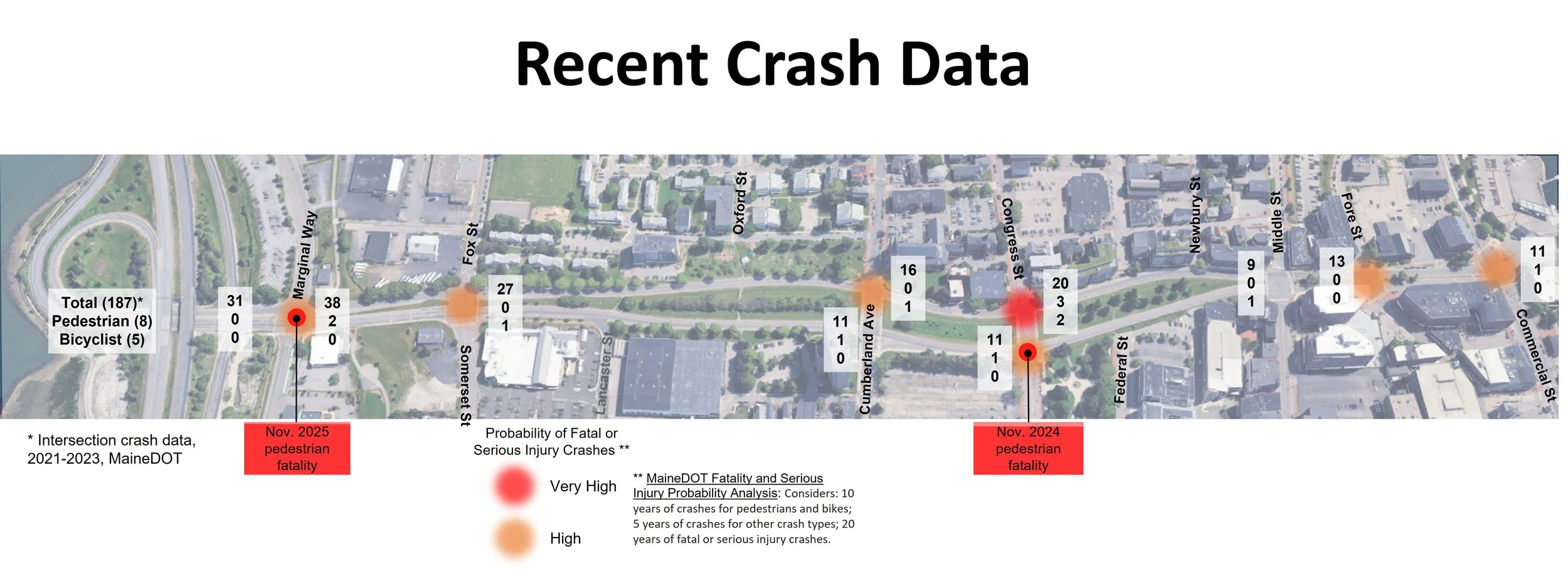 Crash data show significant numbers of crashes and a high probability of fatal and serious injury crashes at Franklin Street intersections. From Exit 7 to Commercial Street, at the ten intersections with traffic signals there were 187 total crashes for the three year period 2021 to 2023. Of those 187 crashes, 8 involved pedestrians and 5 involved bicyclists. Since 2023, two pedestrian fatalities have occurred, in November 2024 and November 2025 at Congress Street and Marginal Way. Seven of the ten locations with signals show a Very High (1) or High (6) probability of crashes resulting in fatal or serious injuries according to an analysis by MaineDOT for crashes through 2024 looking at the 10-year crash history.
